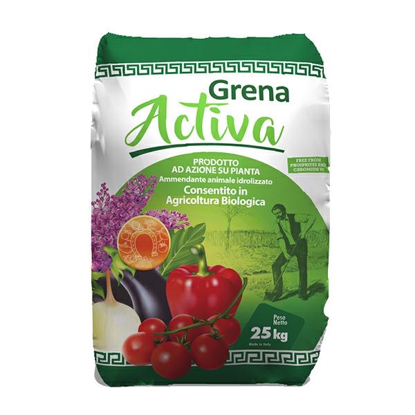 GRENA ACTIVA AMMENDANTE PRODOTTO AD AZIONE SU PIANTA CONSENTITO IN AGRICOLTURA BIOLOGICA GRENA ACTIVA è consigliato per concimazioni di base ORIGINE Farina di carne Stato fisico: pellet 4 mm Confezioni disponibili: sacco da 25 kg – big bags da 500 kg